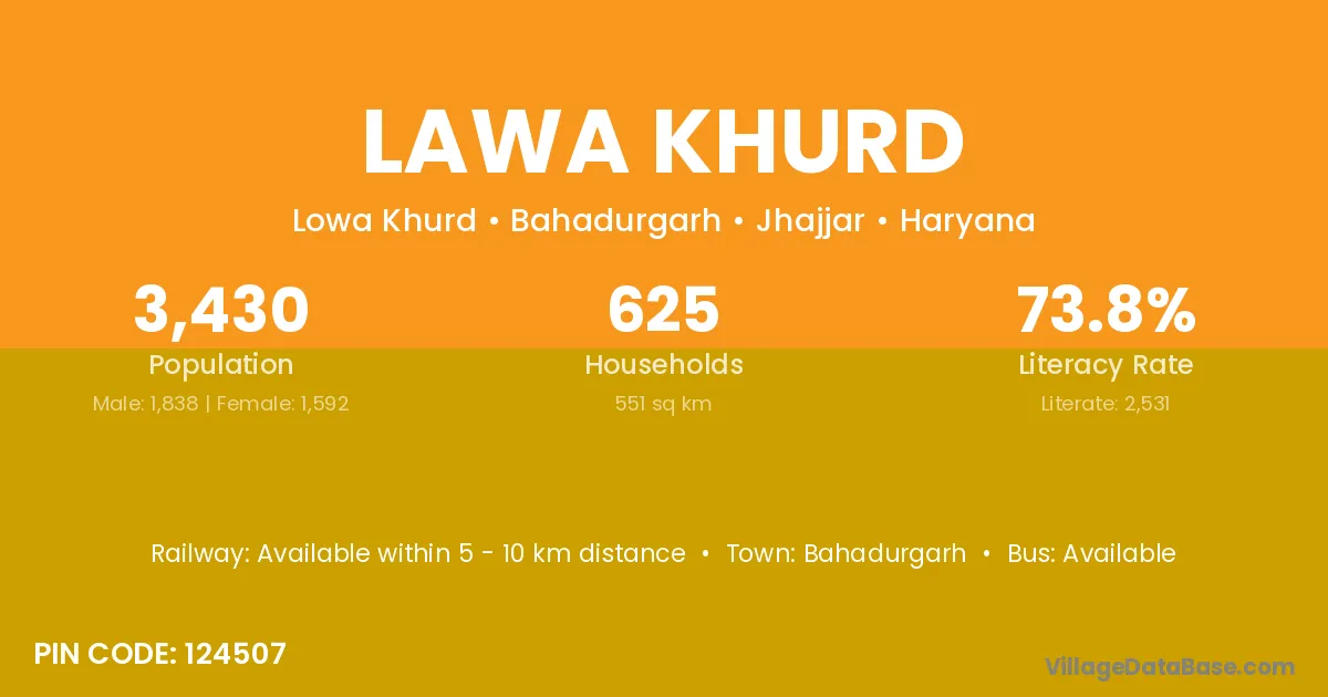 Lawa Khurd village has a total population of 3,430 people, of which 1,838 are males and 1,592 are females.