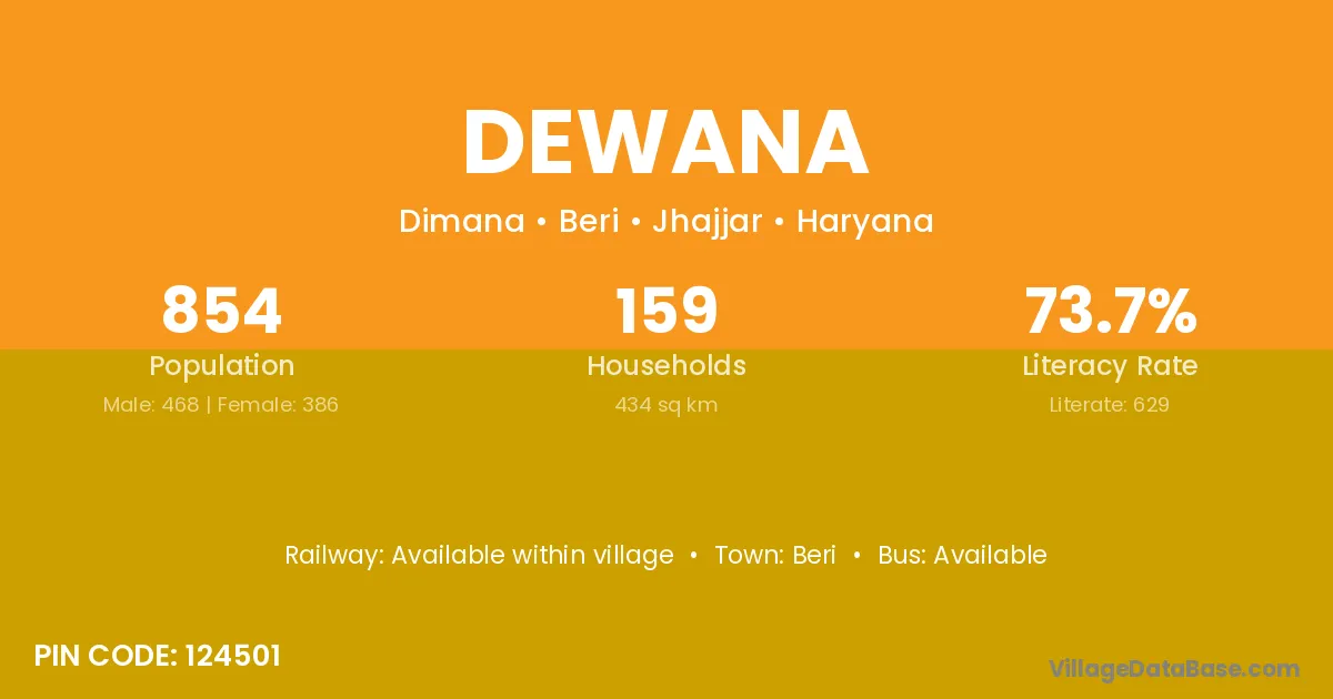 Dewana village has a total population of 854 people, of which 468 are males and 386 are females.