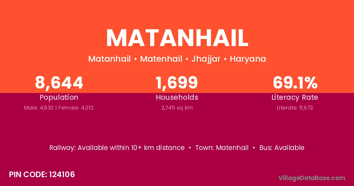 The literacy rate of Matanhail village is 69.09%. Male literacy stands at 77.29% and female literacy at 59.62%.