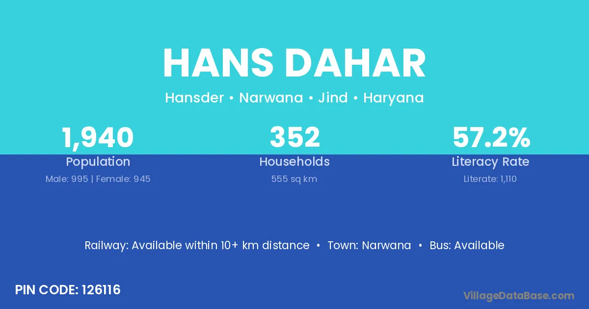 Hans Dahar village has a total population of 1,940 people, of which 995 are males and 945 are females.