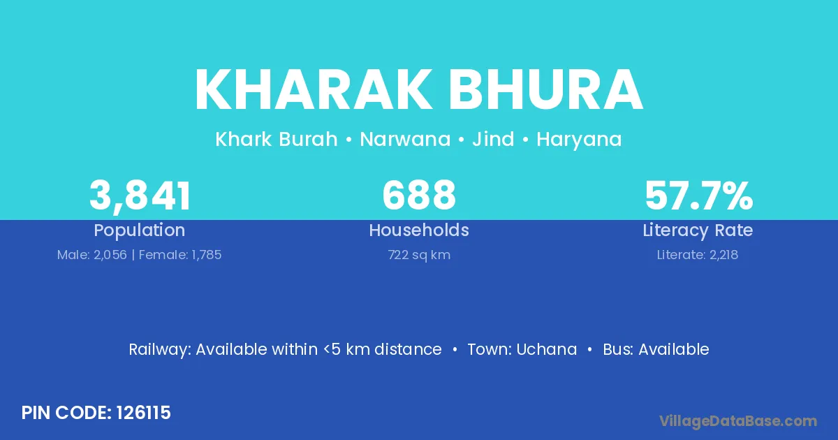 Kharak Bhura village has a total population of 3,841 people, of which 2,056 are males and 1,785 are females.