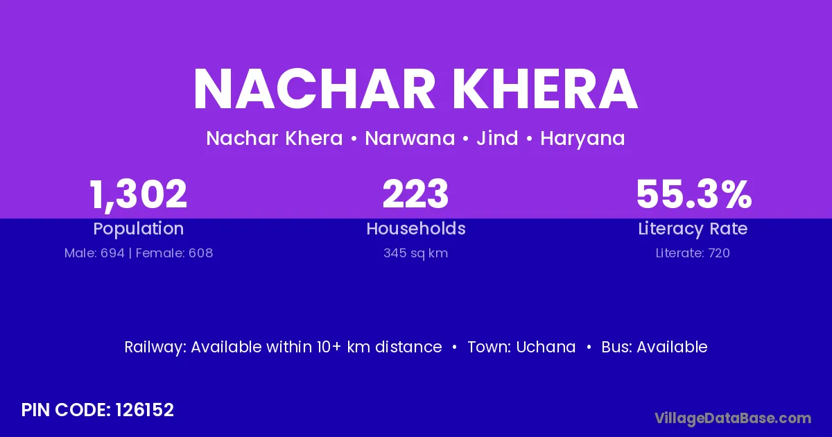 Nachar Khera village has a total population of 1,302 people, of which 694 are males and 608 are females.