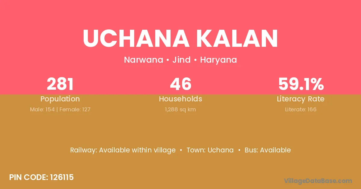 Uchana Kalan village has a total population of 281 people, of which 154 are males and 127 are females.