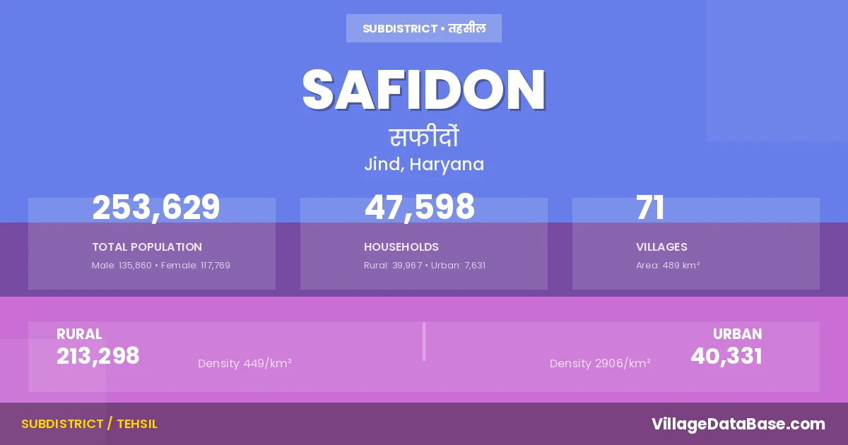 According to the 2011 census The total area of Safidon Tehsil is 489 km², with a population of 253629 people. The population density is 518 inhabitants per square kilometre, and there are approximately 47598 houses in the sub district.