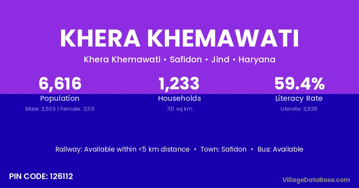 Khera Khemawati village has a total population of 6,616 people, of which 3,503 are males and 3,113 are females.
