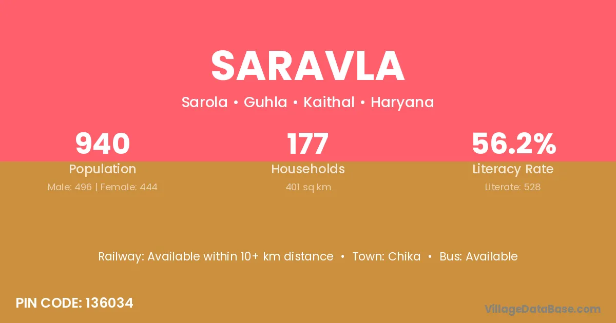 According to Census 2011 information, the village code of Saravla village is 136034.