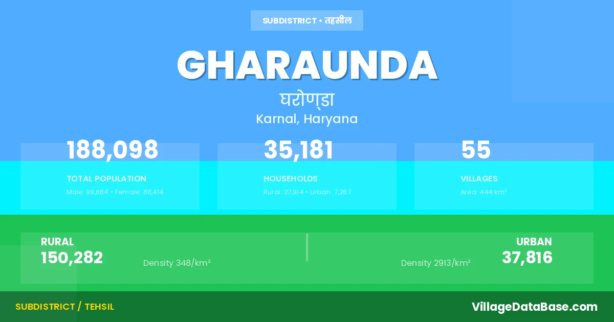 According to the 2011 census The total area of Gharaunda Tehsil is 444 km², with a population of 188098 people. The population density is 423 inhabitants per square kilometre, and there are approximately 35181 houses in the sub district.
