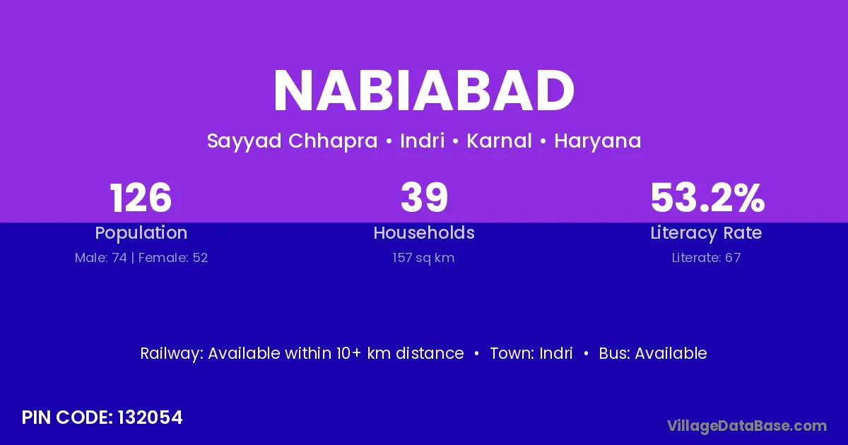 Nabiabad village has a total population of 126 people, of which 74 are males and 52 are females.