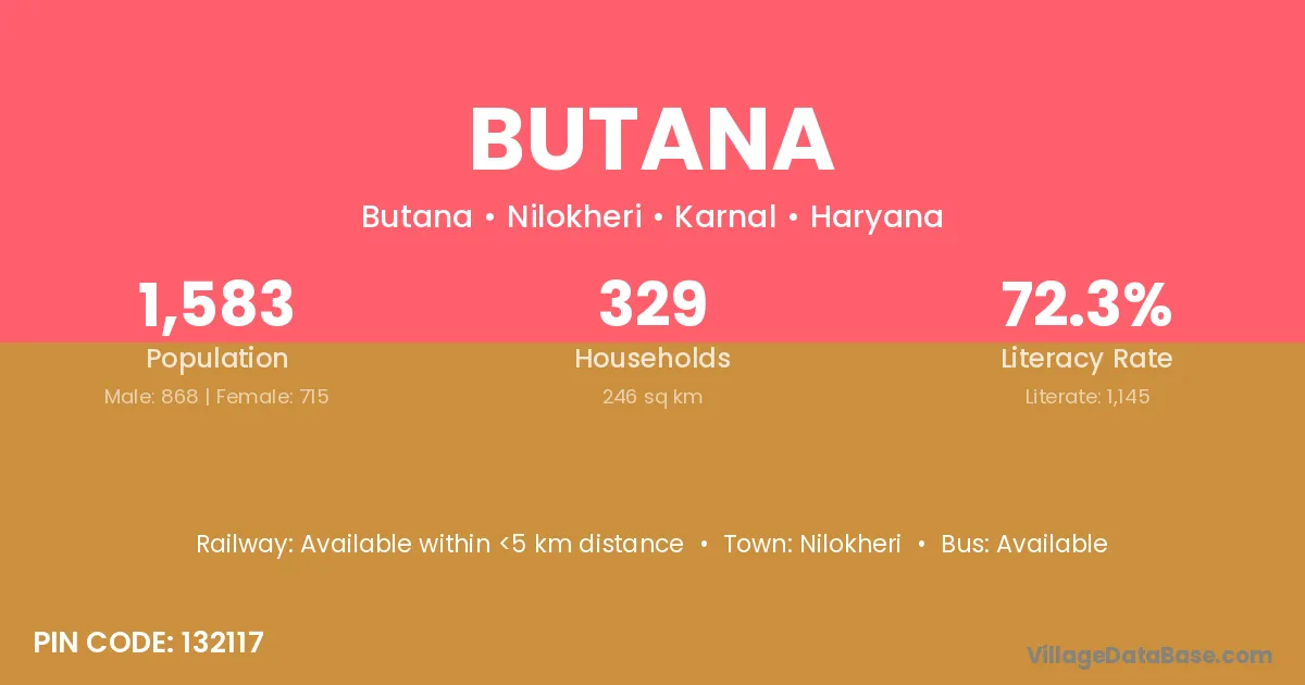 Butana village has a total population of 1,583 people, of which 868 are males and 715 are females.