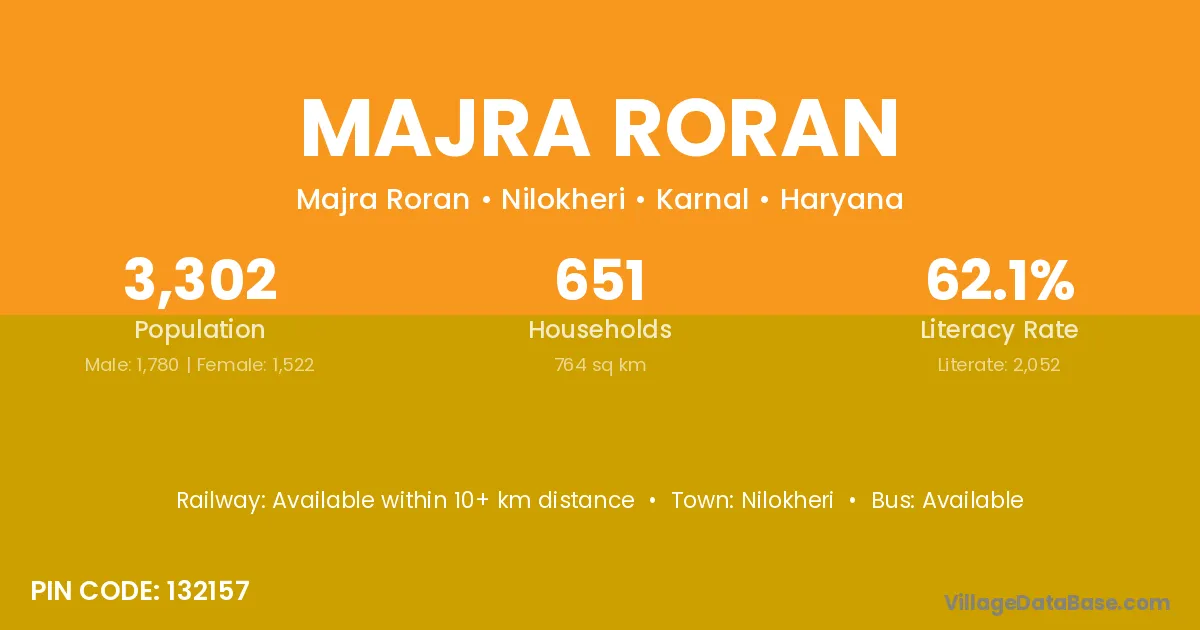 Majra Roran village has a total population of 3,302 people, of which 1,780 are males and 1,522 are females.