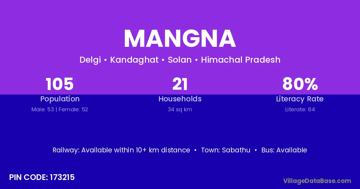 Mangna village has a total population of 2,134 people, of which 1,134 are males and 1,000 are females.