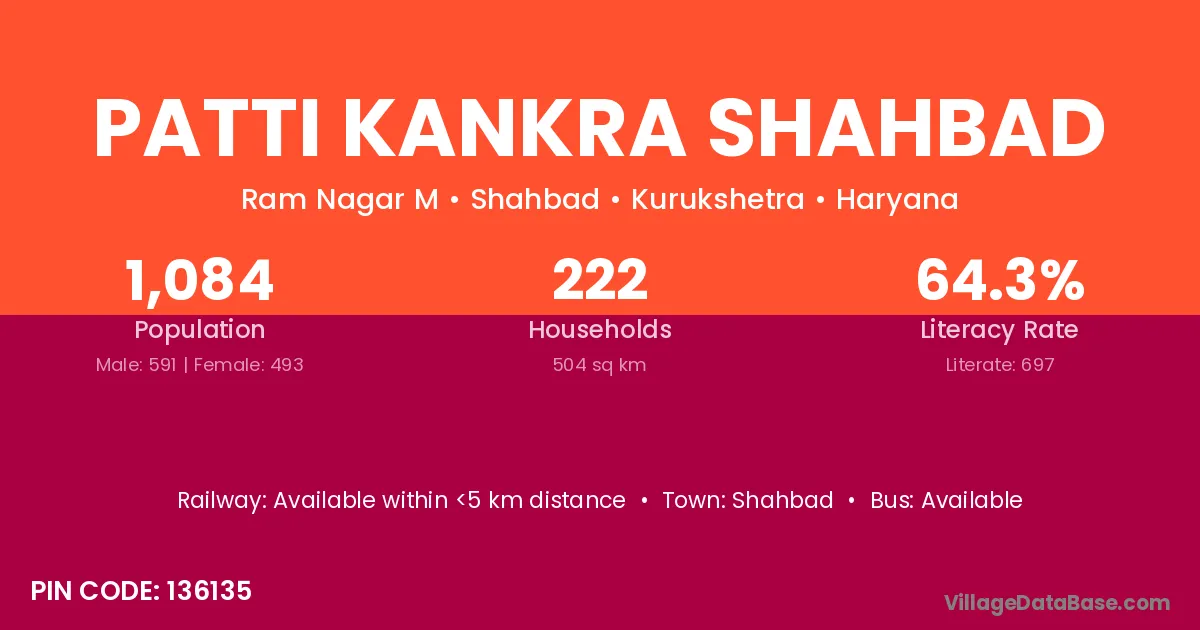 According to Census 2011 information, the village code of Patti Kankra Shahbad village is 136135.