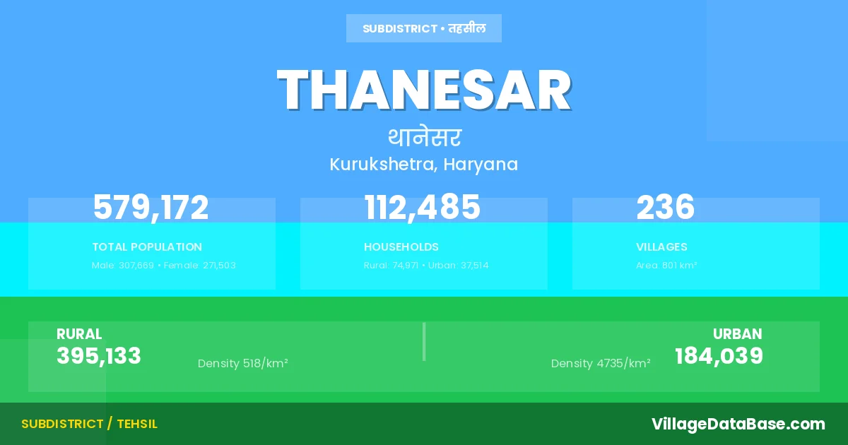 According to the 2011 census The total area of Thanesar Tehsil is 801 km², with a population of 579172 people. The population density is 723 inhabitants per square kilometre, and there are approximately 112485 houses in the sub district.