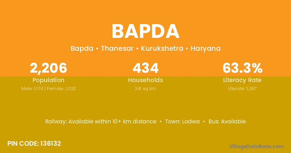 Bapda village has a total population of 2,206 people, of which 1,174 are males and 1,032 are females.