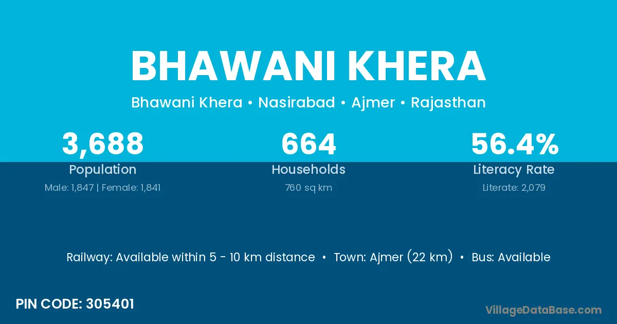 The literacy rate of Bhawani Khera village is 64.42%. Male literacy stands at 69.34% and female literacy at 58.55%.
