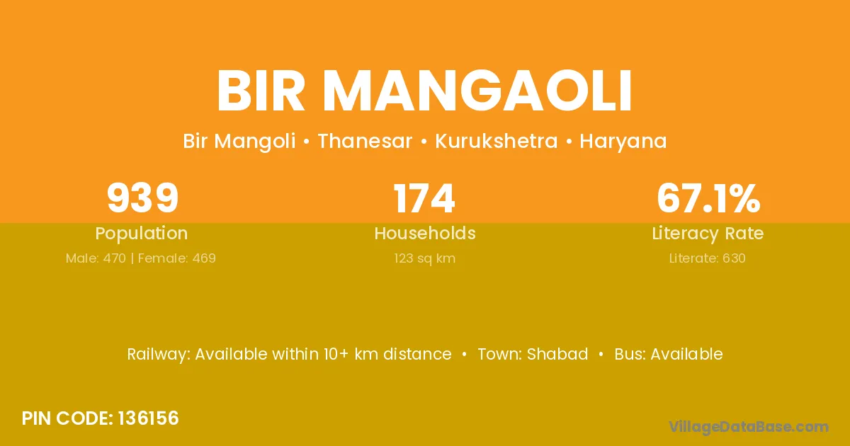 Bir Mangaoli village has a total population of 939 people, of which 470 are males and 469 are females.