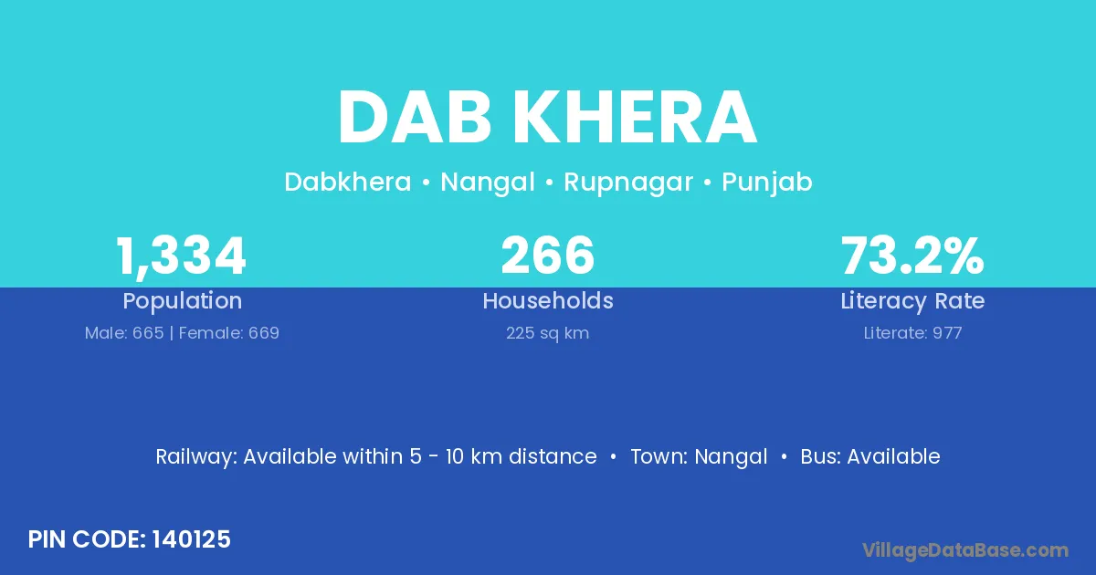 Dab Khera village has a total population of 1,583 people, of which 846 are males and 737 are females.