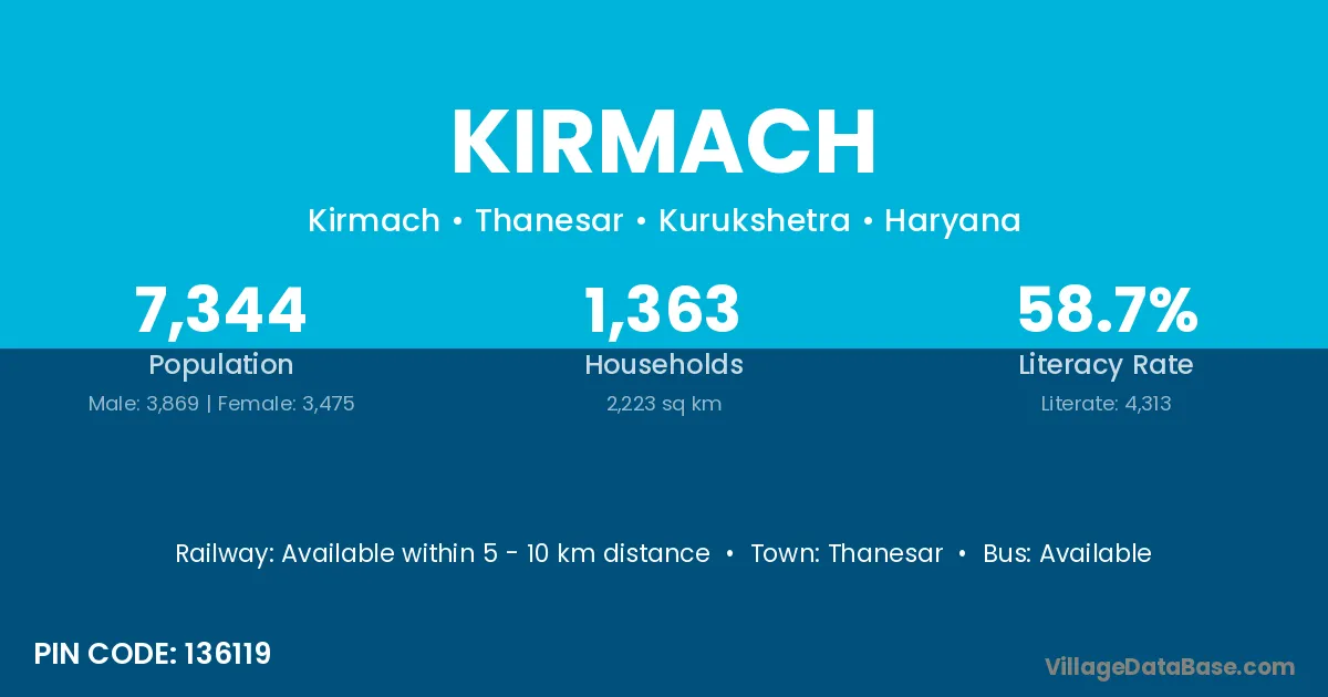 Kirmach village has a total population of 7,344 people, of which 3,869 are males and 3,475 are females.