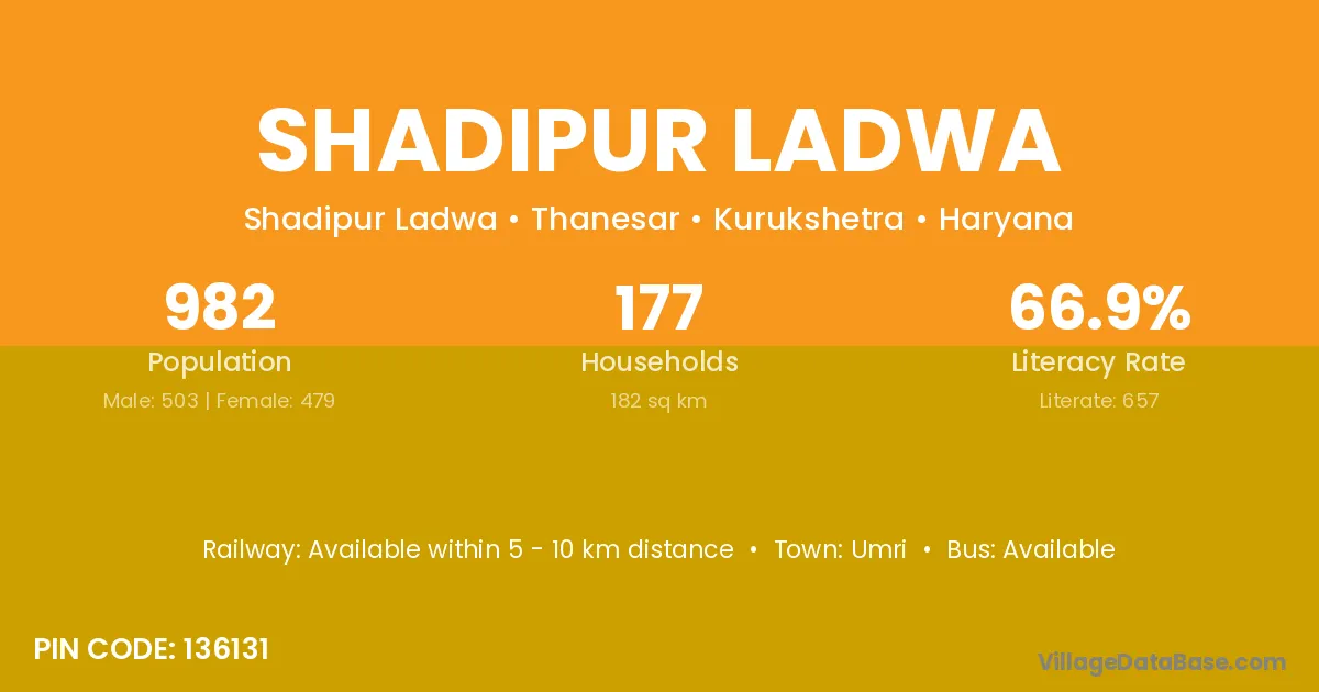 Shadipur Ladwa village has a total population of 982 people, of which 503 are males and 479 are females.