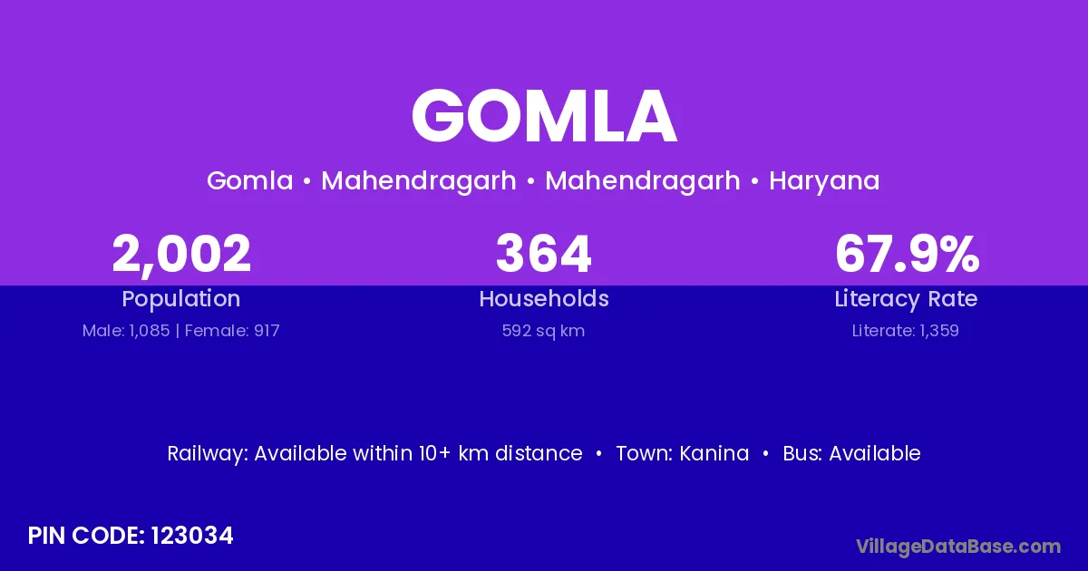 Gomla village has a total population of 2,002 people, of which 1,085 are males and 917 are females.