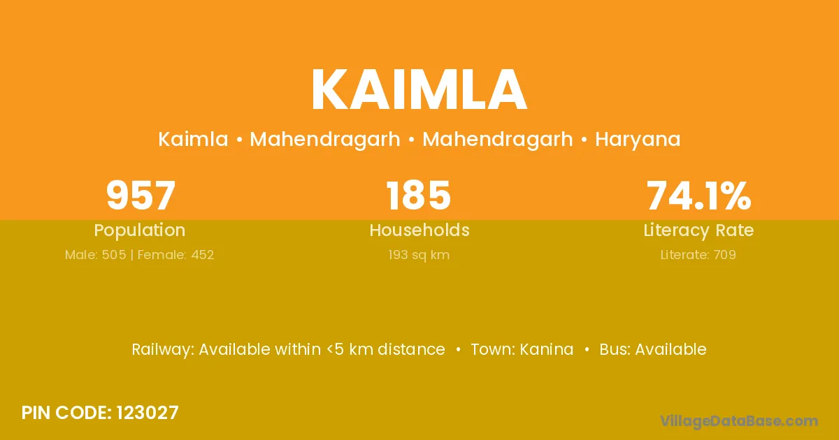 Kaimla village has a total population of 957 people, of which 505 are males and 452 are females.