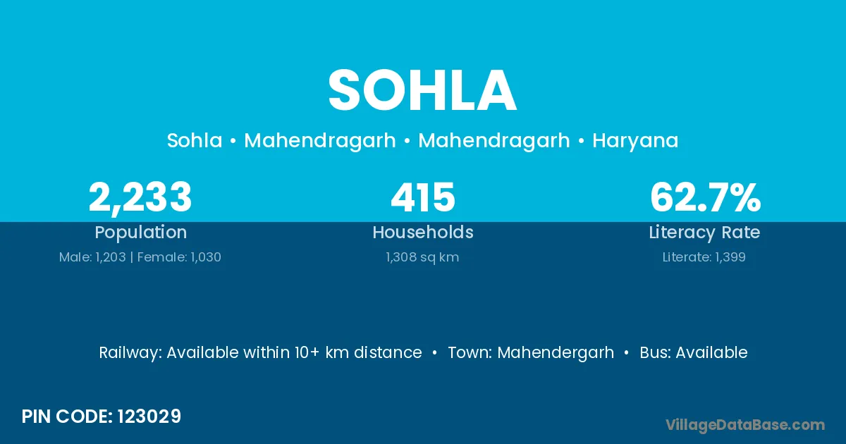 Sohla village has a total population of 2,233 people, of which 1,203 are males and 1,030 are females.