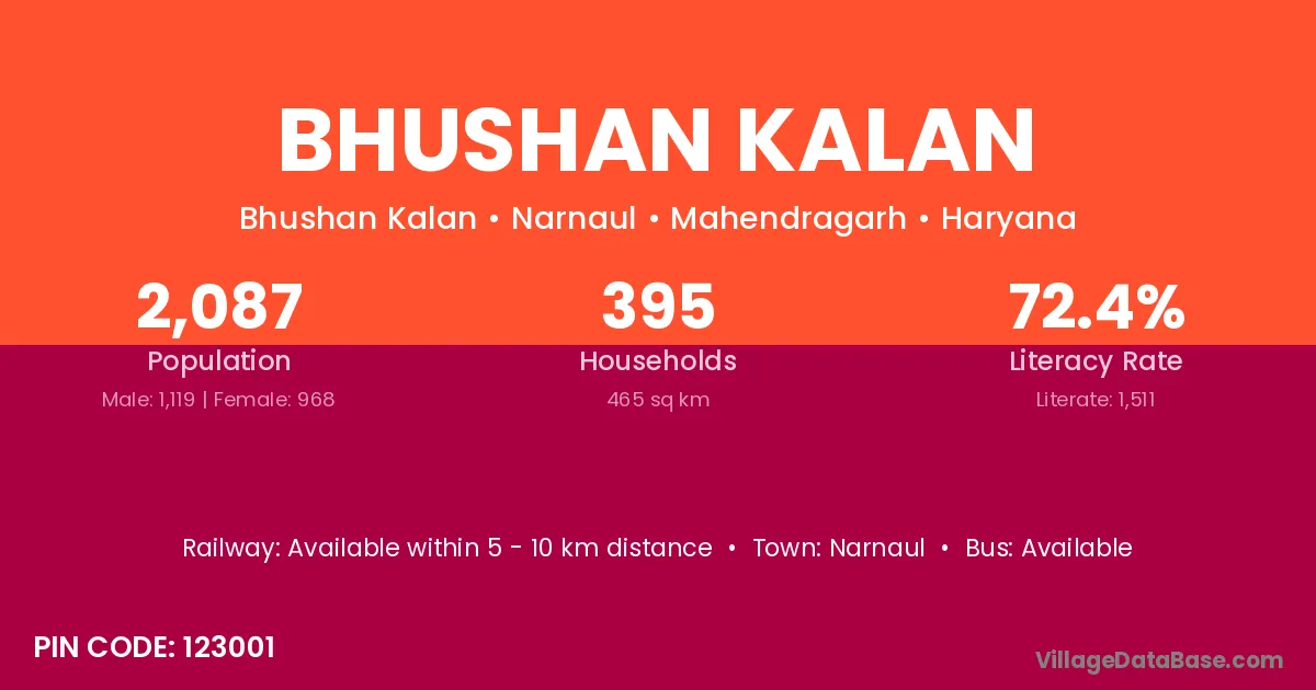 Bhushan Kalan village has a total population of 2,087 people, of which 1,119 are males and 968 are females.