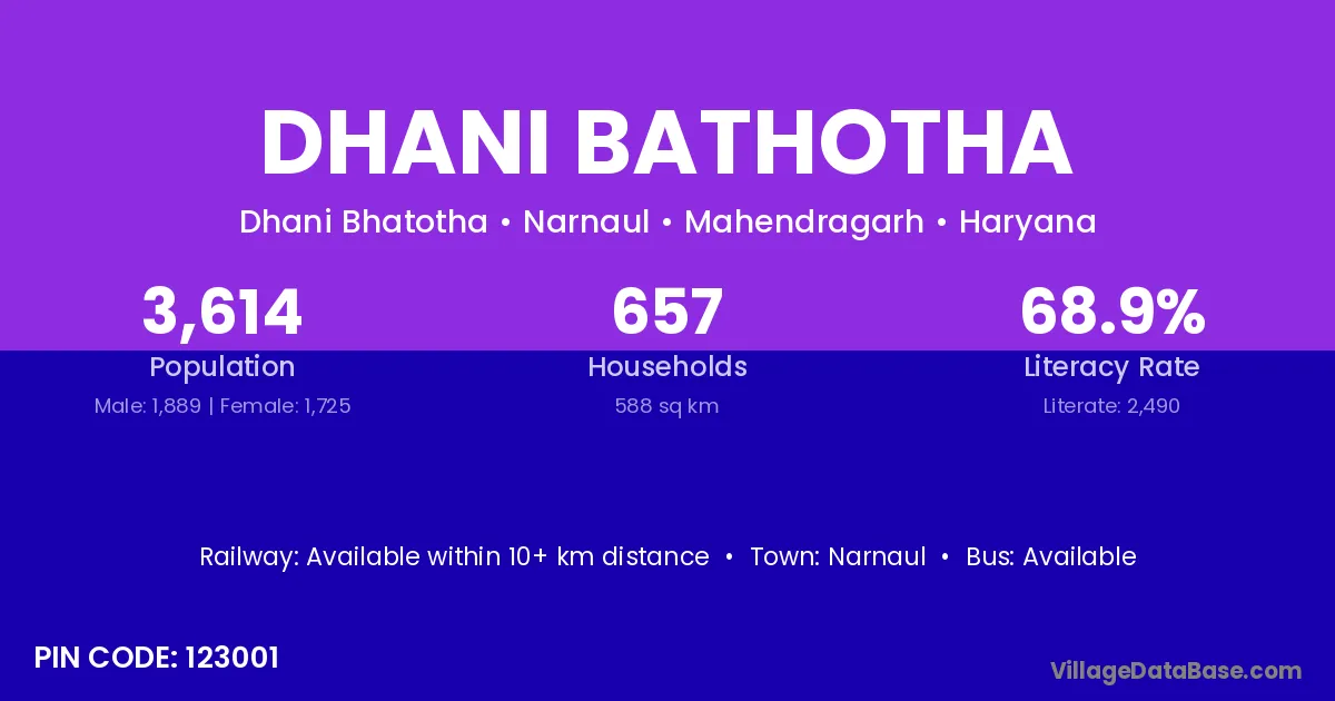 Dhani Bathotha village has a total population of 3,614 people, of which 1,889 are males and 1,725 are females.