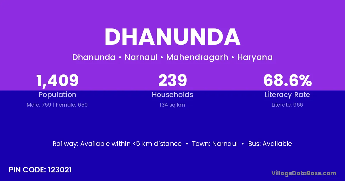 Dhanunda village has a total population of 1,409 people, of which 759 are males and 650 are females.