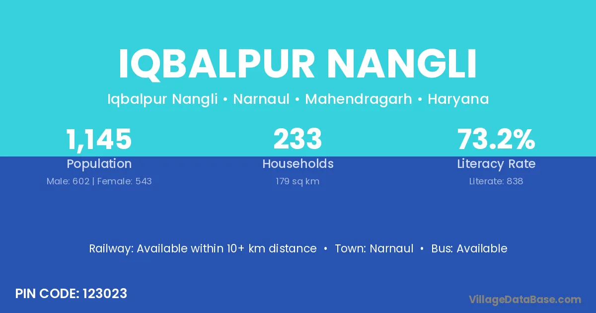 Iqbalpur Nangli village has a total population of 1,145 people, of which 602 are males and 543 are females.