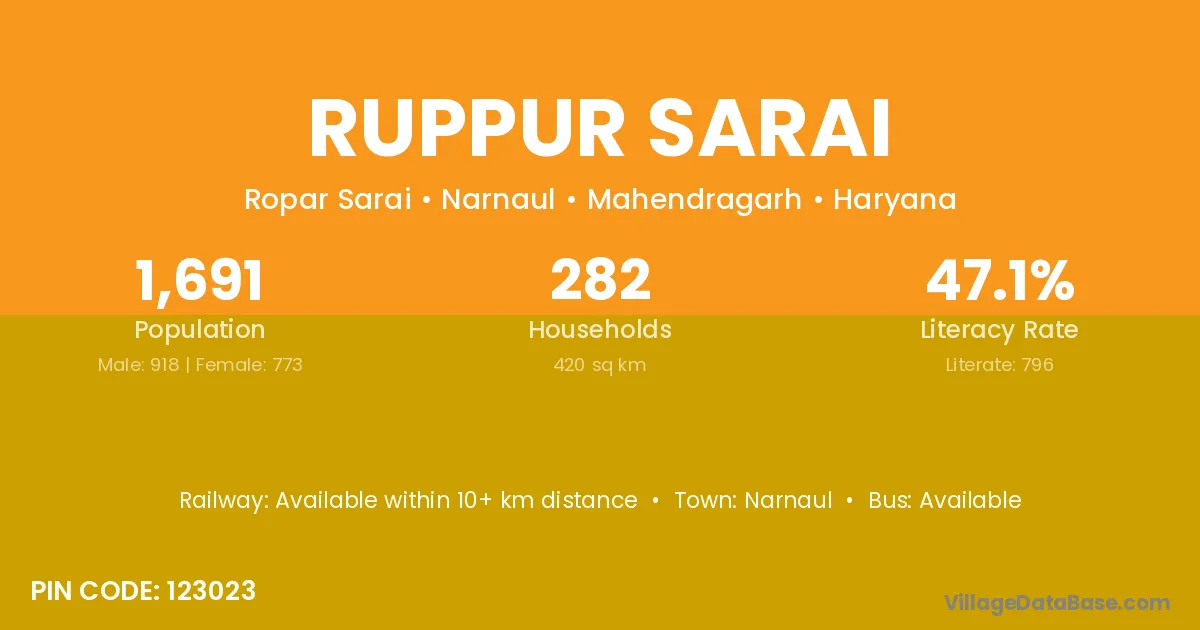 Ruppur Sarai village has a total population of 1,691 people, of which 918 are males and 773 are females.