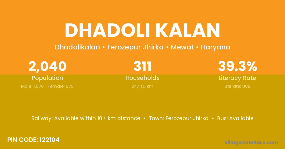 Ferozepur Jhirka is the nearest town to Dhadoli Kalan village for major economic activities