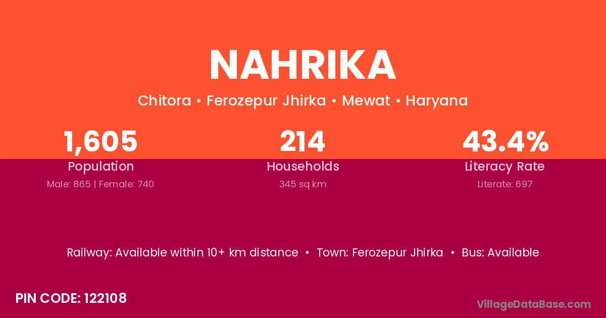 Nahrika village has a total population of 1,605 people, of which 865 are males and 740 are females.