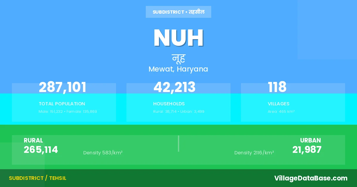 According to the 2011 census The total area of Nuh Tehsil is 465 km², with a population of 287101 people. The population density is 617 inhabitants per square kilometre, and there are approximately 42213 houses in the sub district.