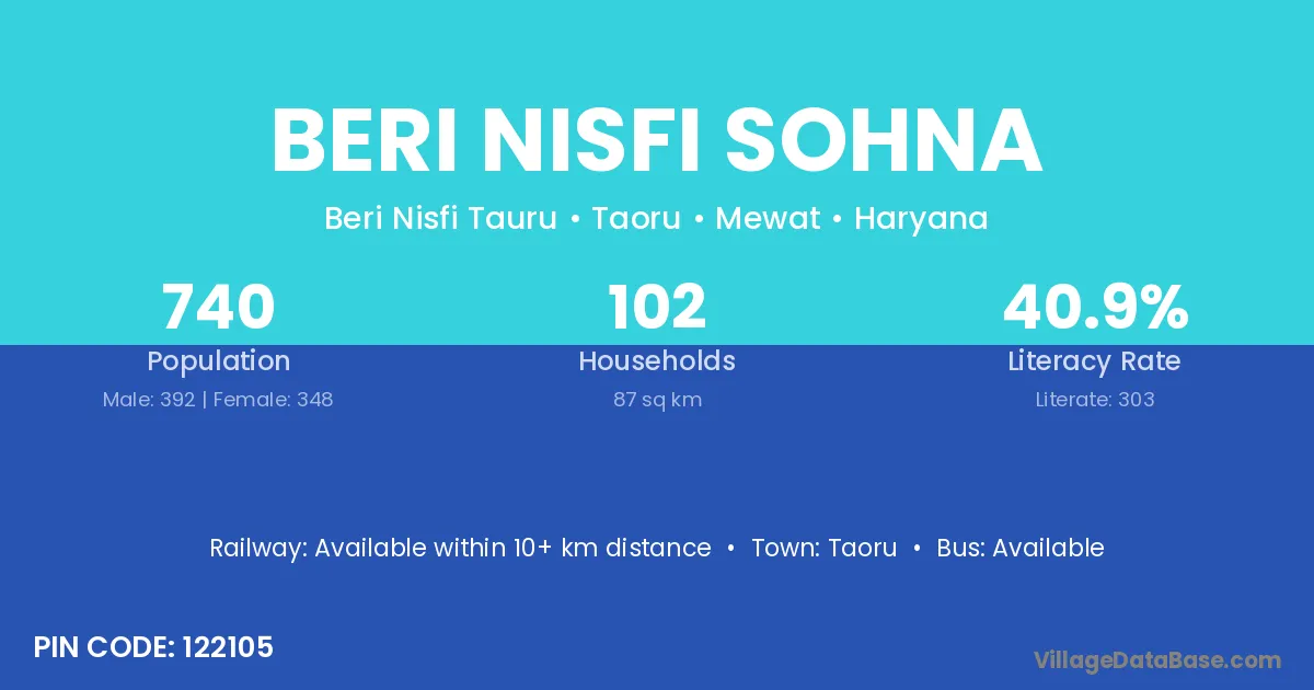 Beri Nisfi Sohna village has a total population of 740 people, of which 392 are males and 348 are females.