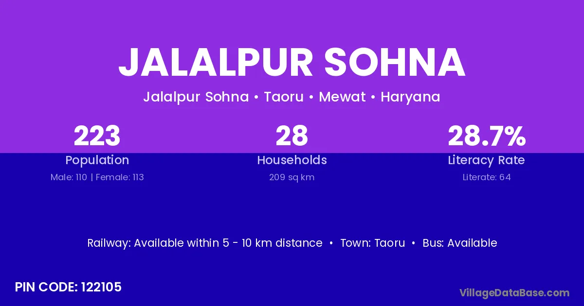 Jalalpur Sohna village has a total population of 223 people, of which 110 are males and 113 are females.