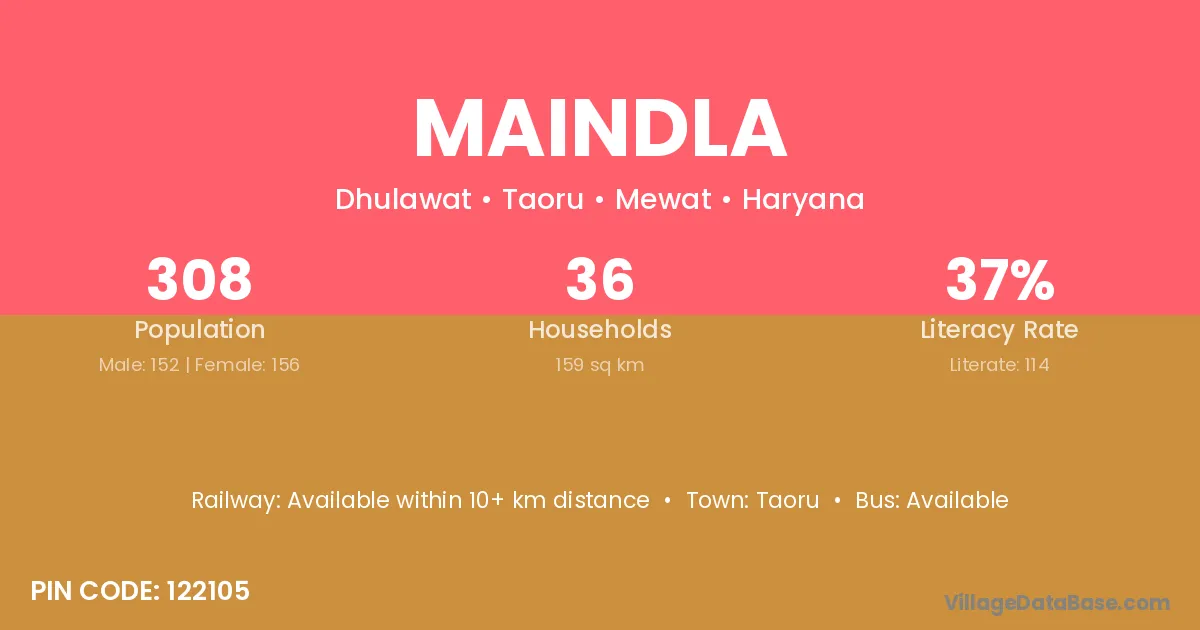 Maindla village has a total population of 308 people, of which 152 are males and 156 are females.