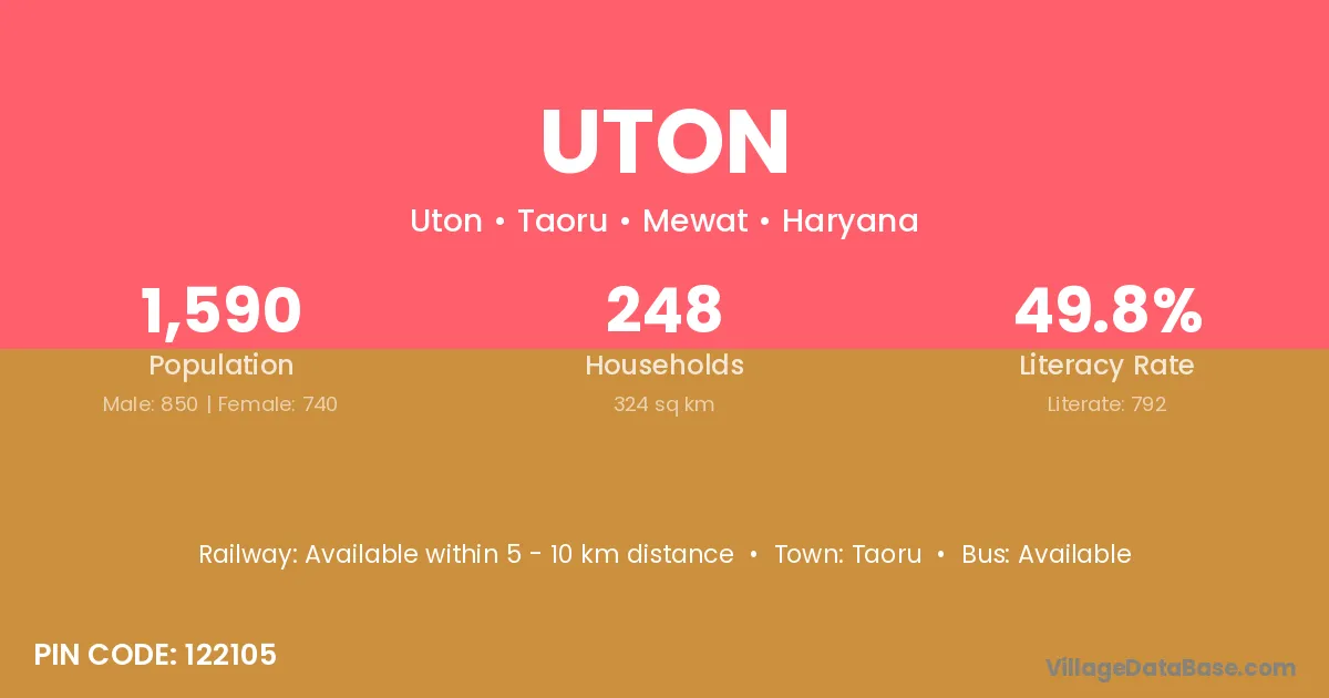 Uton village has a total population of 1,590 people, of which 850 are males and 740 are females.