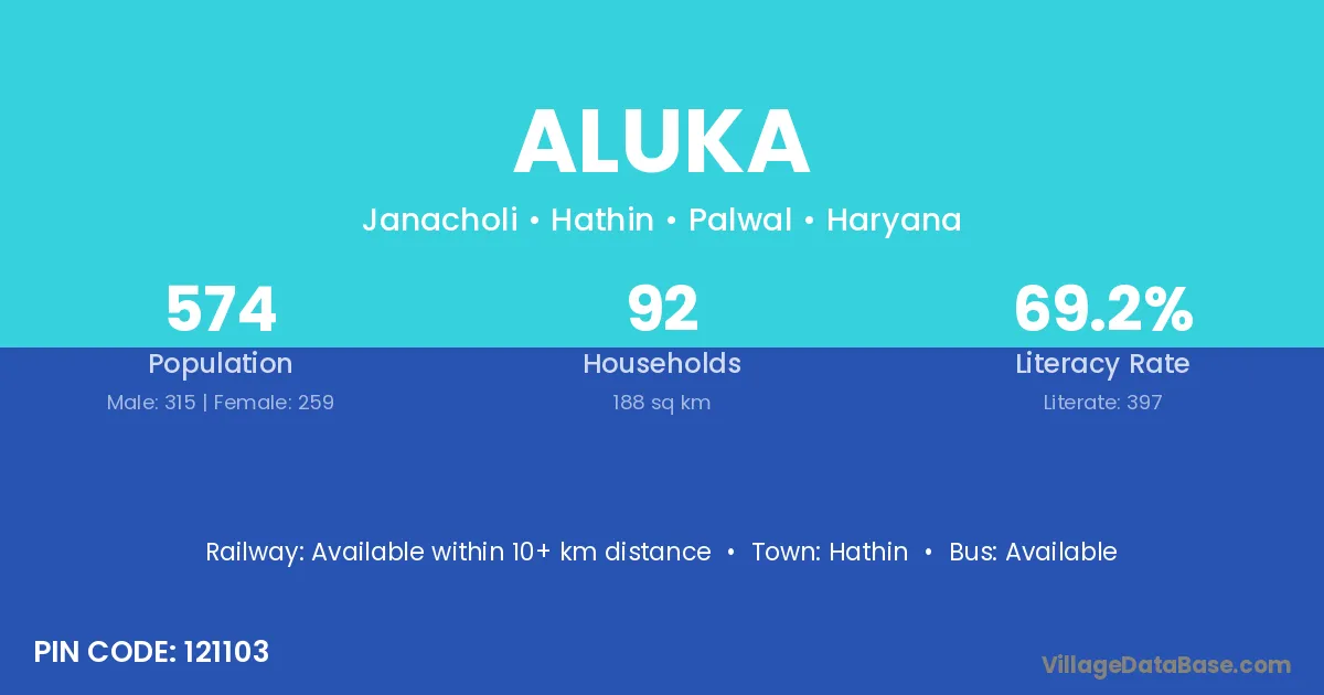 According to Census 2011 information, the village code of Aluka village is 121103.