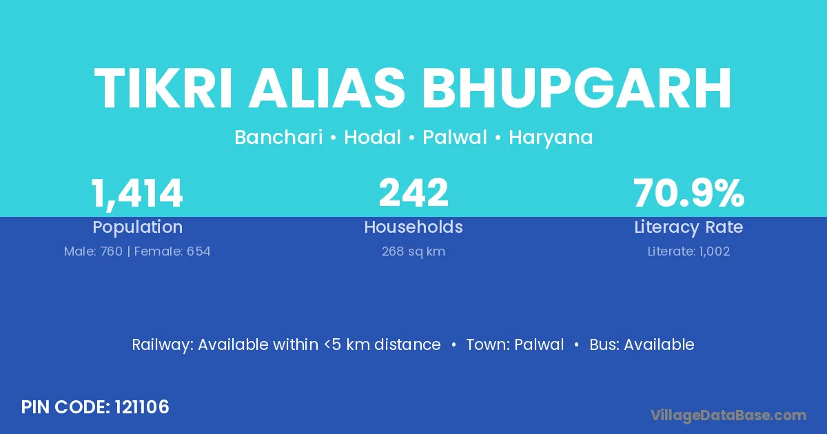 Palwal is the nearest town to Tikri Alias Bhupgarh village for major economic activities