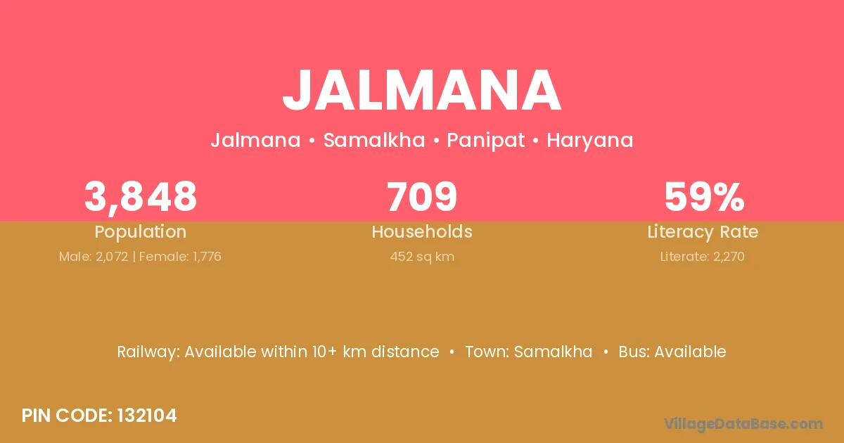 According to Census 2011 information, the village code of Jalmana village is 132104.