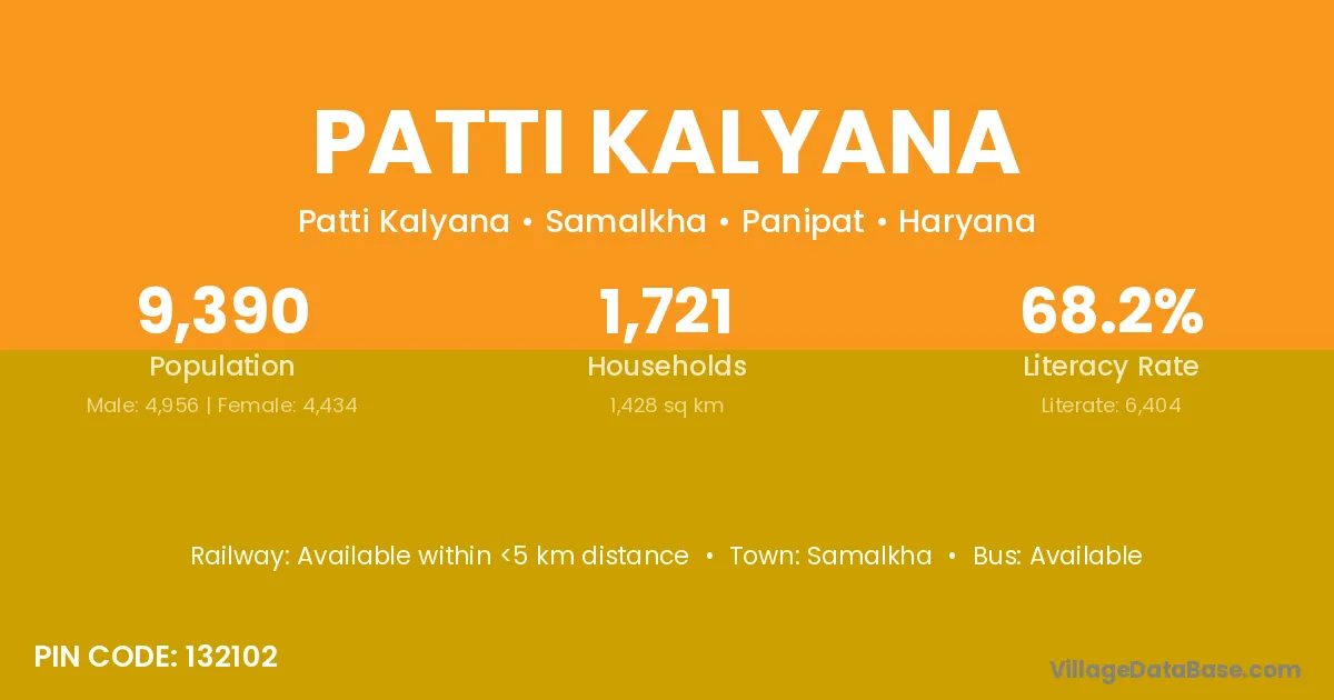 Patti Kalyana village has a total population of 9,390 people, of which 4,956 are males and 4,434 are females.