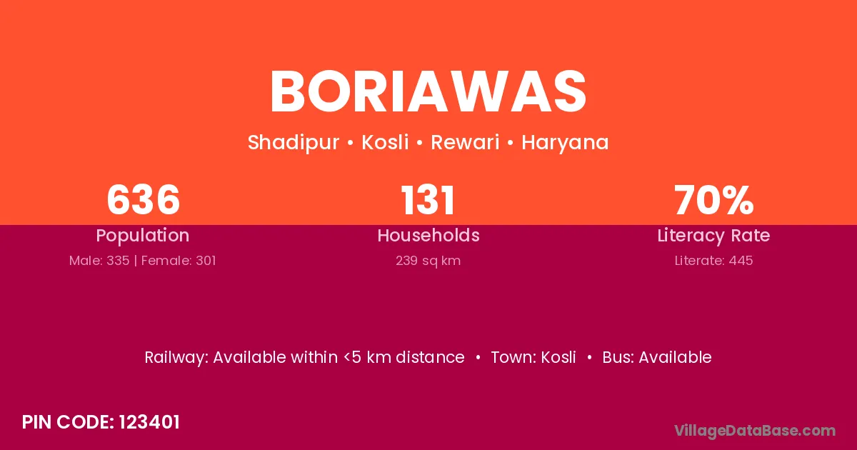 Boriawas village has a total population of 636 people, of which 335 are males and 301 are females.