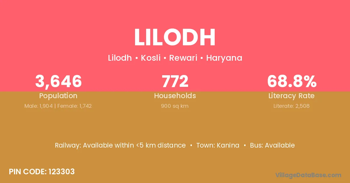 Lilodh village has a total population of 3,646 people, of which 1,904 are males and 1,742 are females.