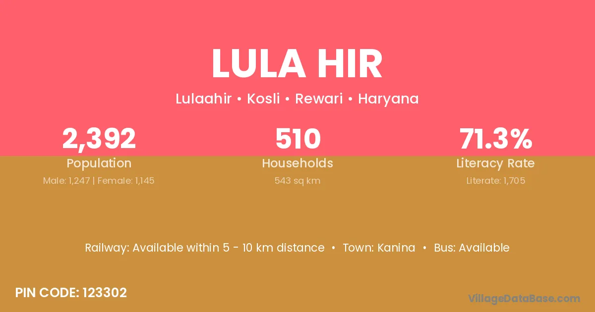 Lula Hir village has a total population of 2,392 people, of which 1,247 are males and 1,145 are females.