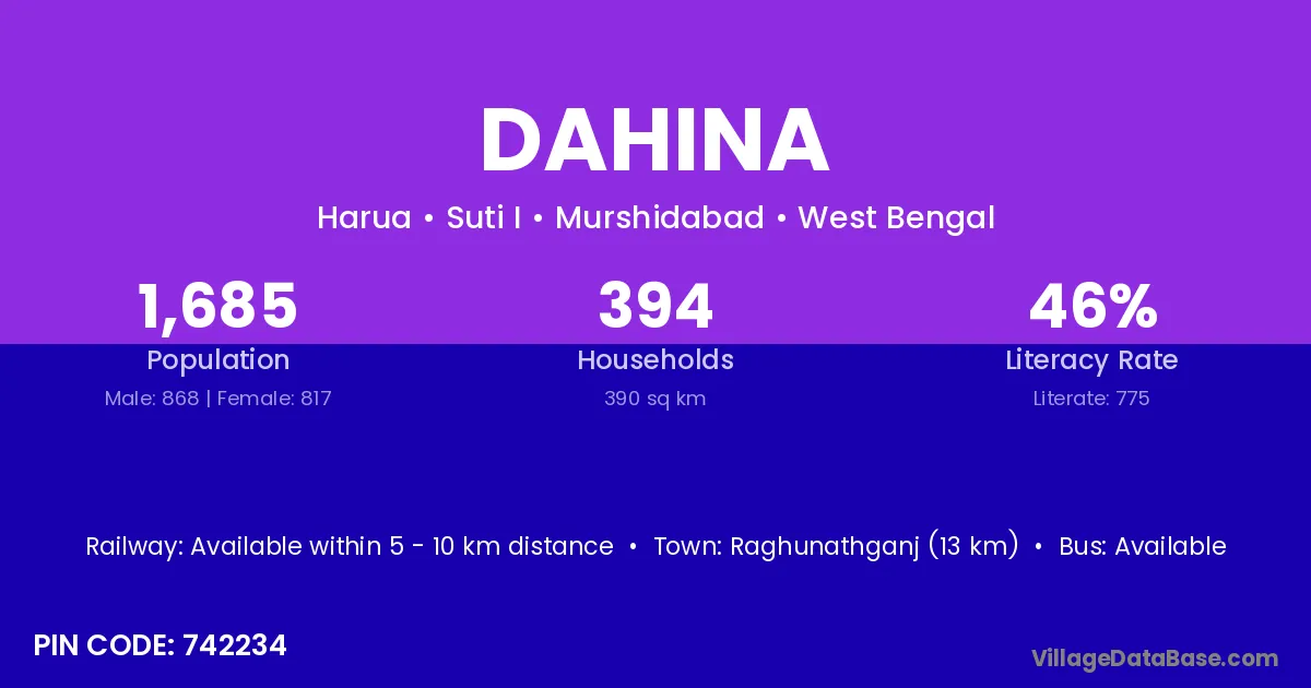 Dahina village has a total population of 7,246 people, of which 3,741 are males and 3,505 are females.