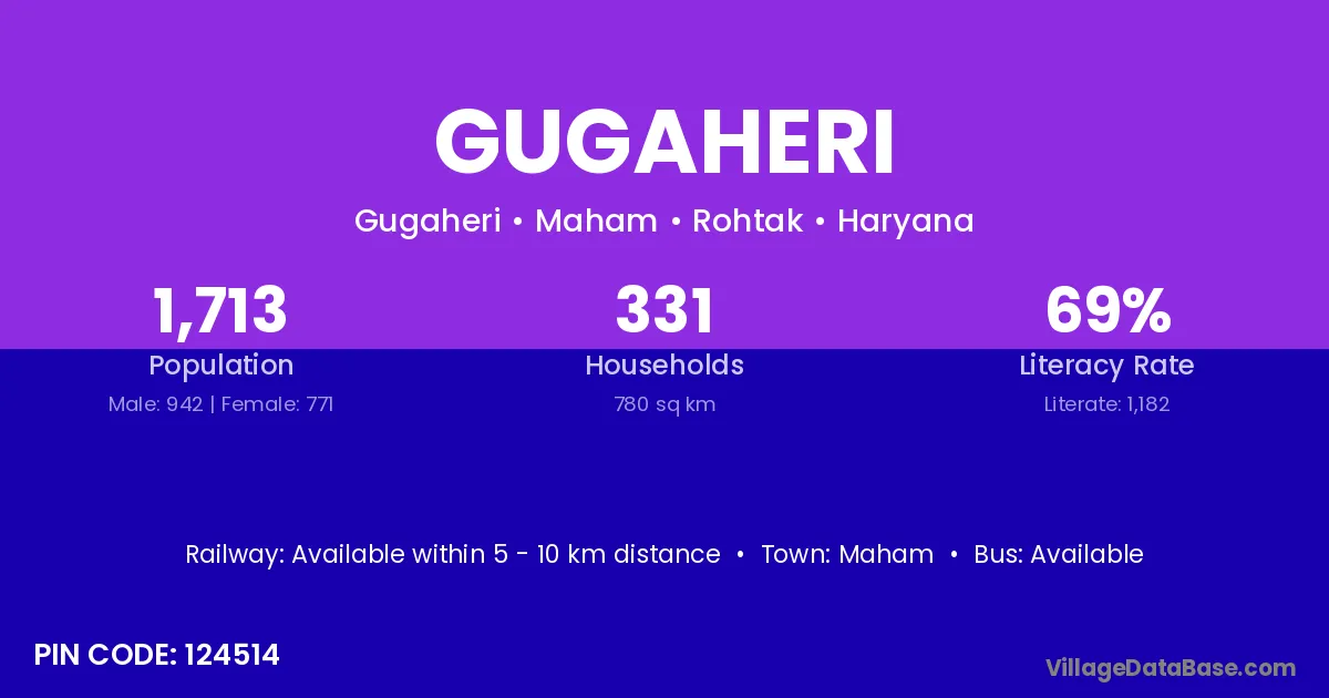 Gugaheri village has a total population of 1,713 people, of which 942 are males and 771 are females.