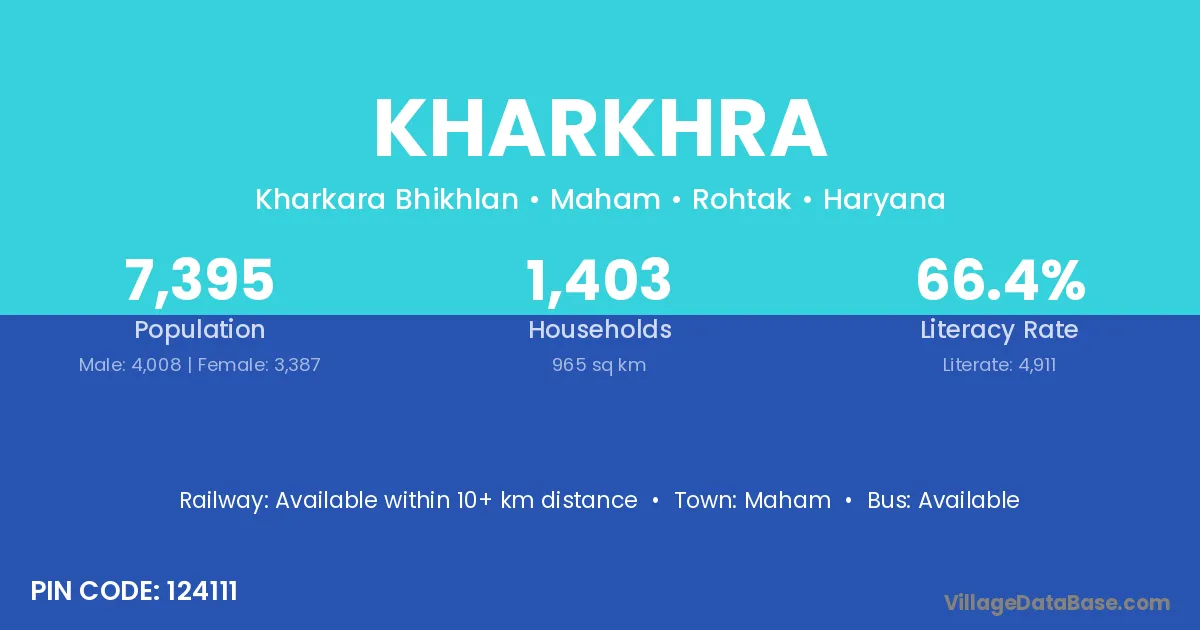 Kharkhra village has a total population of 7,395 people, of which 4,008 are males and 3,387 are females.