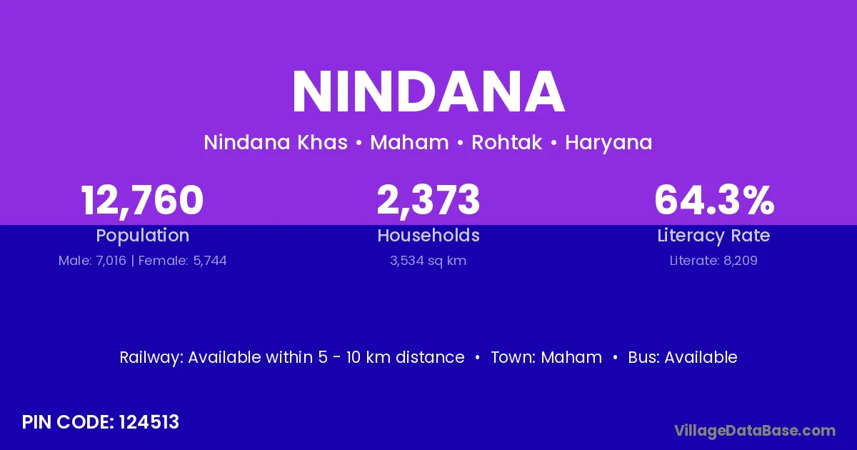 Nindana village has a total population of 12,760 people, of which 7,016 are males and 5,744 are females.