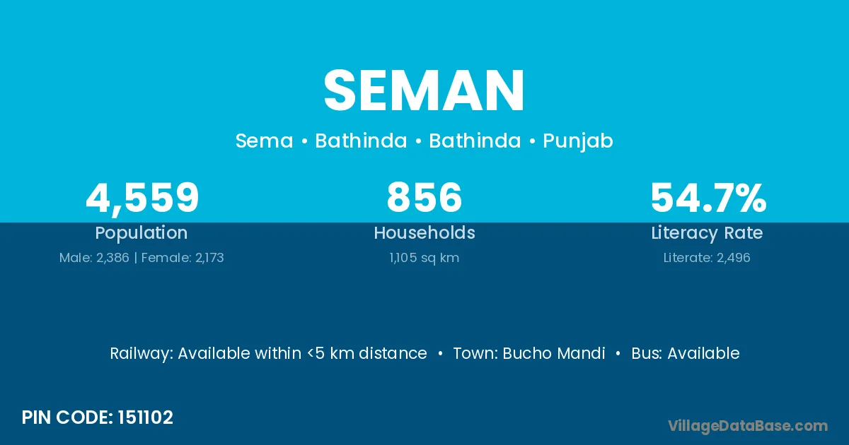 The literacy rate of Seman village is 65.34%. Male literacy stands at 73.15% and female literacy at 56.52%.